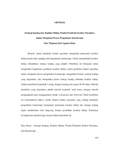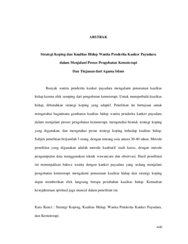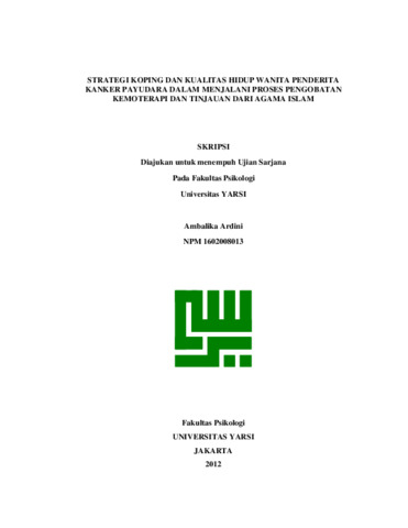 Ardini, Ambalika (2012) STRATEGI KOPING DAN KUALITAS HIDUP WANITA PENDERITA KANKER PAYUDARA DALAM MENJALANI PROSES PENGOBATAN KEMOTERAPI DAN TINJAUAN DARI AGAMA ISLAM. Diploma thesis, Universitas YARSI.