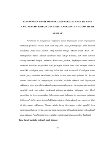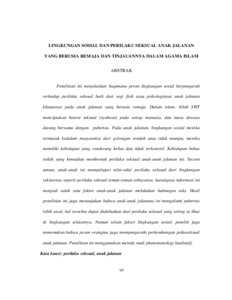 Penelitian ini menjelaskan bagimana peran lingkungan sosial berpengaruh terhadap perilaku seksual baik dari segi fisik atau psikologisnya anak jalanan khususnya pada anak jalanan yang berusia remaja. Dalam islam. Allah SWT menciptakan hasrat seksual (syahwat) pada setiap manusia, dan masa dewasa datang bersama dengan pubertas. Pada anak jalanan, lingkungan sosial mereka termasuk kedalam masyarakat dari golongan rendah atau tidak mampu, mereka memiliki kehidupan yang cenderung bebas dan tidak terkontrol. Kehidupan bebas inilah yang kemudian membentuk perilaku seksual anak-anak jalanan ini. Secara umum, anak-anak ini mempelajari nilai-nilai perilaku seksual dari lingkungan sekitarnya seperti perilaku seksual teman-teman sebayanya. kurangnya informasi ini menjadi salah satu faktor anak-anak jalanan melakukan hubungan seks. Hasil penelitian ini juga menunjukan bahwa anak-anak jalanana ini mengalami pubertas lebih awal, hal tersebut dapat diakibatkan dari perilaku seksual yang sering ia lihat di lingkungan sekitarnya. Namun selain faktor lingkungan sosial, peneliti juga menemukan bahwa peran orangtua juga mempengaruhi perkembangan psikoseksual anak jalanan. Penelitian ini menggunakan metode studi phenomenologi kualitatif.
